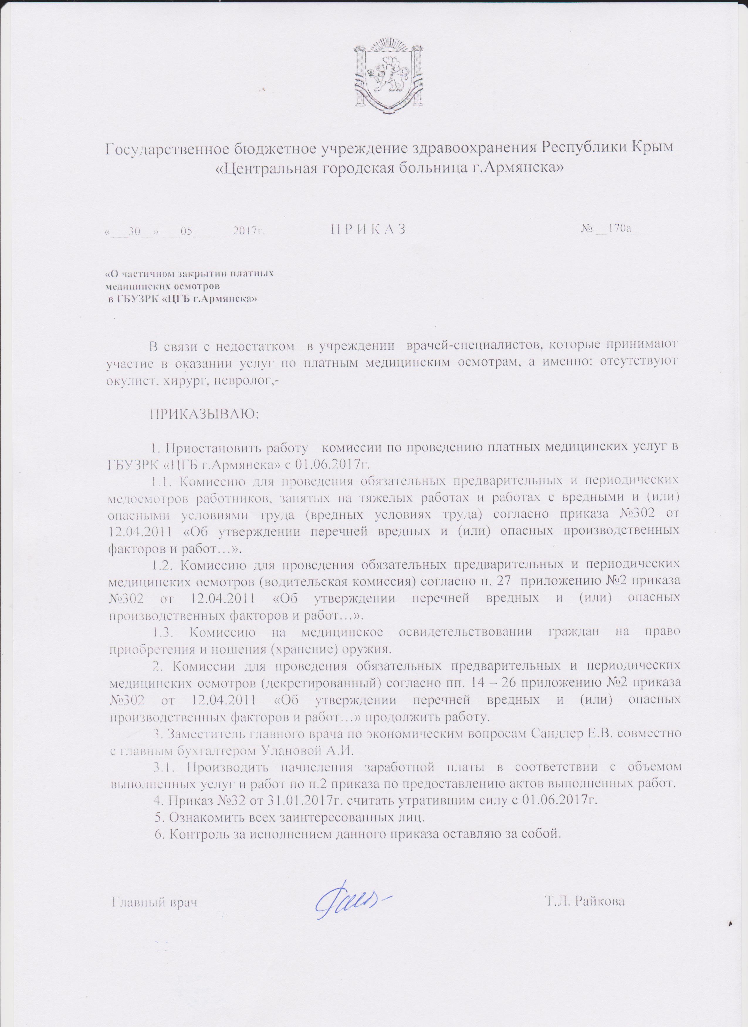 Приказ о частичном закрытии платных медицинских осмортов в ГБУЗ РК "ЦГБ г.Армянска".